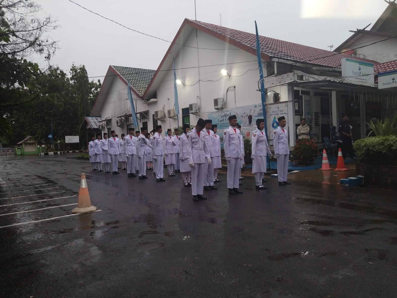 Tanah Laut, 1 Juni 2024 - Upacara penurunan Bendera Merah Putih dalam rangka Hari Lahir Pancasila di halaman Kantor Bupati Tanah Laut berlangsung khidmat meskipun diguyur hujan. Semangat para anggota Pasukan Pengibar Bendera Pusaka (Paskibraka) tak surut sedikit pun oleh cuaca yang kurang bersahabat.